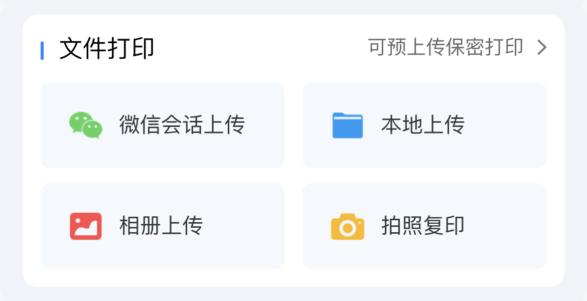 财智e办公小程也可实现各类格式文件以及图片上传打印,例如Word、PPT、Excel、PDF、png、JPG等文件;也可以选择从微信会话上传、本地上传、相册上传、拍照复印进行打印。