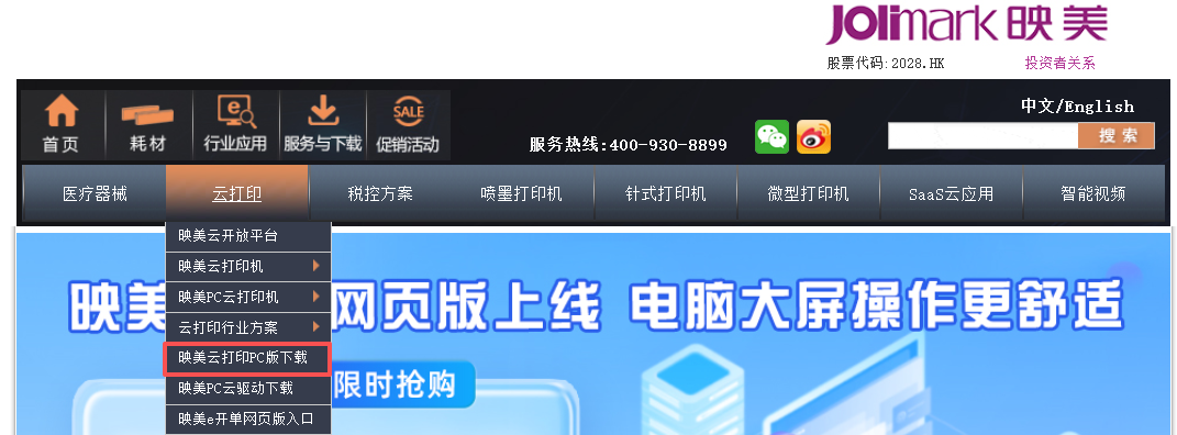 步骤1:打开映美官网,在“云打印”下拉菜单中,点击“映美云打印PC版下载”,将会自动下载软件。