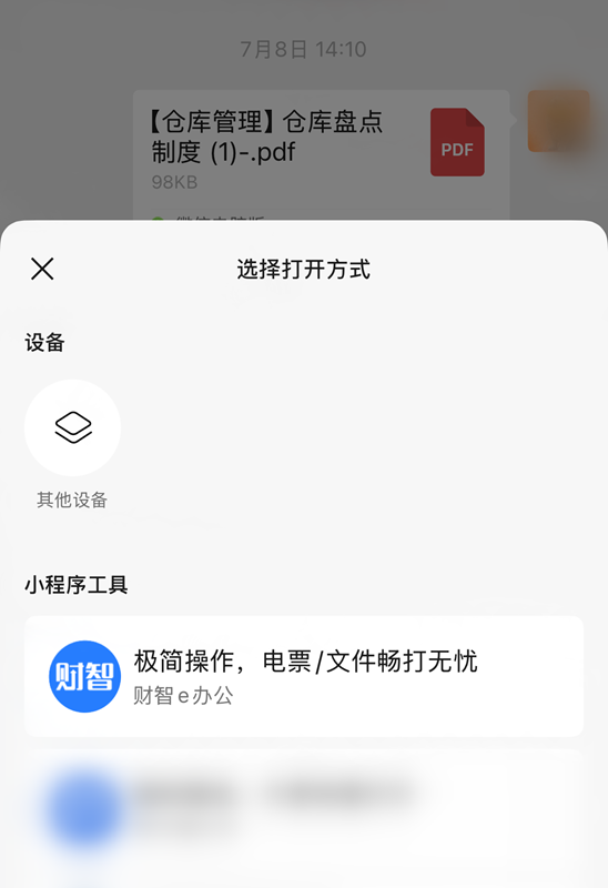 ① 在微信会话中长按需要打印的文件,然后点击“打开”>“财智e办公小程序”,文件将会自动上传。