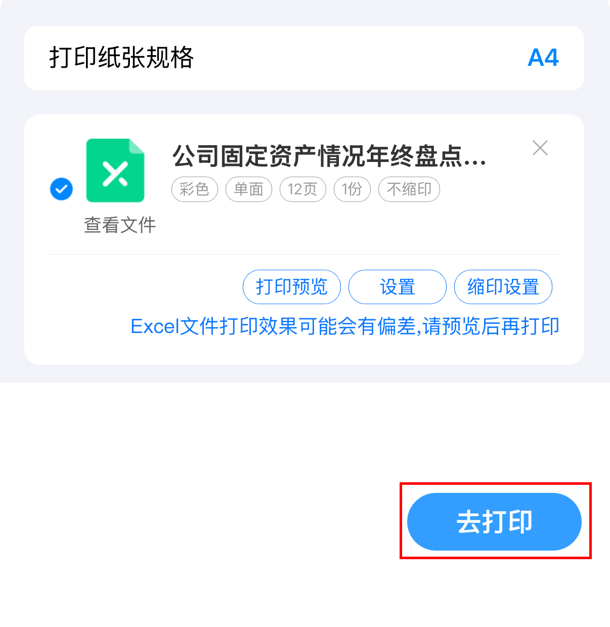 ② 上传成功后,勾选文件,点击“去打印”,打印机即会开始打印输出。