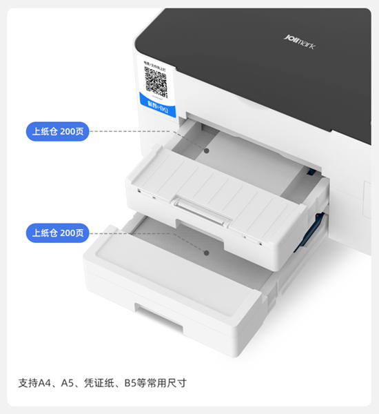 l  双纸仓机型支持最高400张纸张容量,A4/A5/凭证纸全兼容。