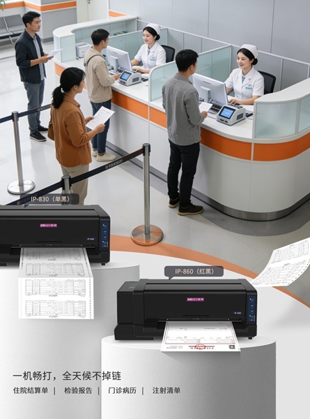 每天成百上千份检验单、处方笺、住院记录流转不停,医院对打印设备的要求,从来不止 “能打”,更是要“稳打、快打”!今天,就为大家介绍一款专为高强度打印场景打造的——连续纸喷墨打印机(IP-830/IP-860)。