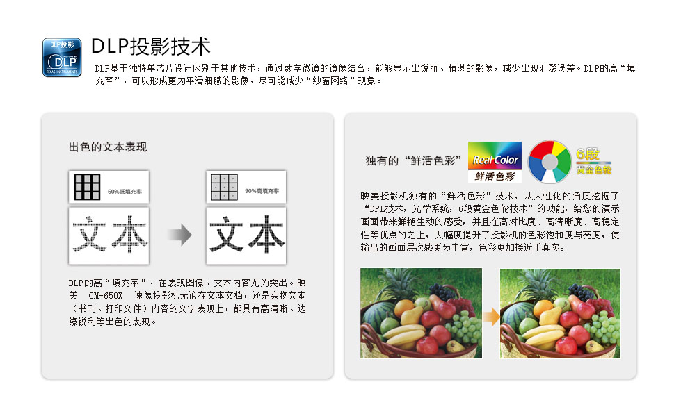 映美CM-650X打破传统投影机固有的“单”投影概念,在原有的影像投影的基础上内置了超低畸变超广角鱼眼摄像镜头,实现文件实物投影功能,是一款真正的多功能投影机。您无须花费时间去制作昂贵的投影OHP胶片,既节省了时间,又大大降低了成本和资源,并具有真正的环保意义。例如会议中途新增的统计数据或书籍引用、政府发文、报纸、手绘图纸等材料,学术课堂上学生绘画的图画、书法、书写作业等等,再无须等待扫描、数据传输等繁琐步骤,直接通过CM-650X便能即时投影分析、研讨、共享。